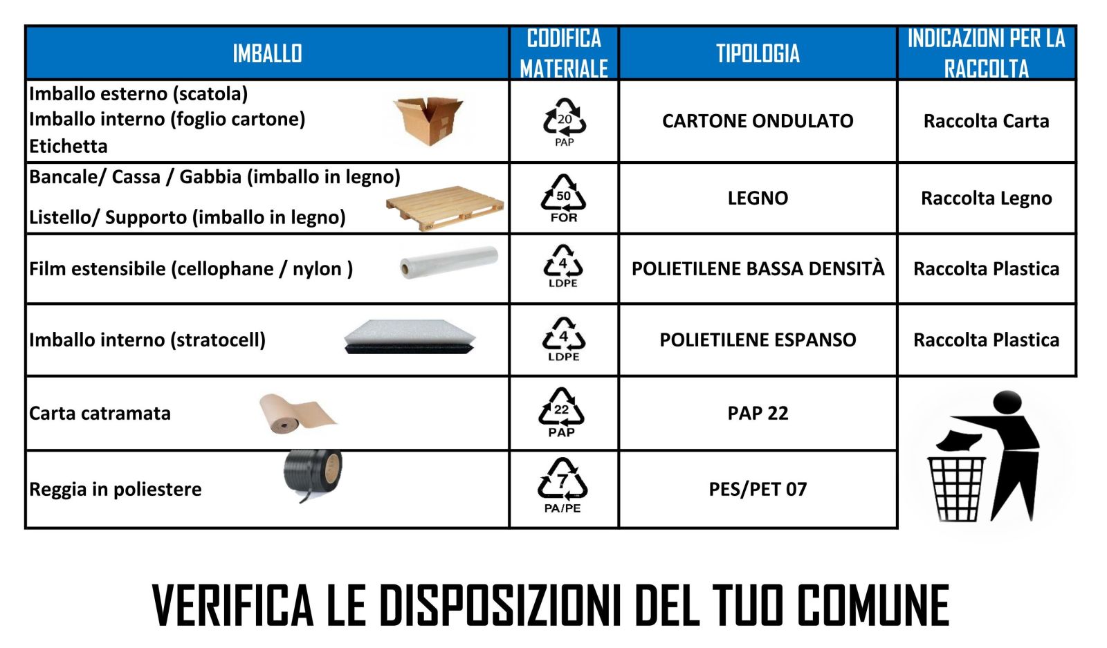 Gli imballaggi destinati al B2B devono obbligatoriamente ripotare la codifica dei materiali di composizione in conformità alla Decisione 129/97/CE. Tutte le altre informazioni sono volontariamente applicabili.